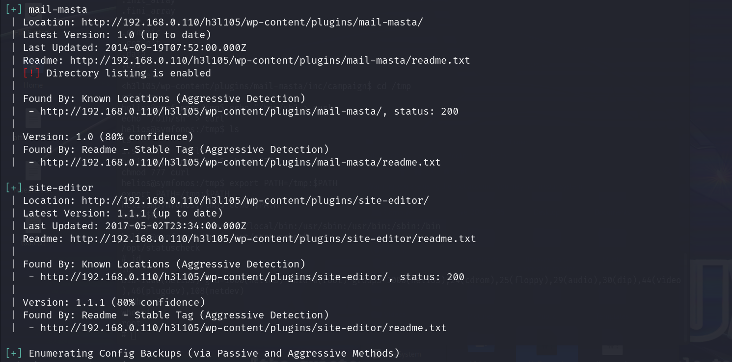 wpscan --url http://192.168.0.110/h3l105/ --plugins-detection aggressive