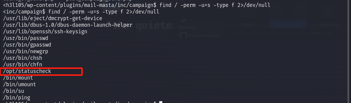 发现存在statuscheck似乎为用户创建的,使用strings命令查看statuscheck中的字符