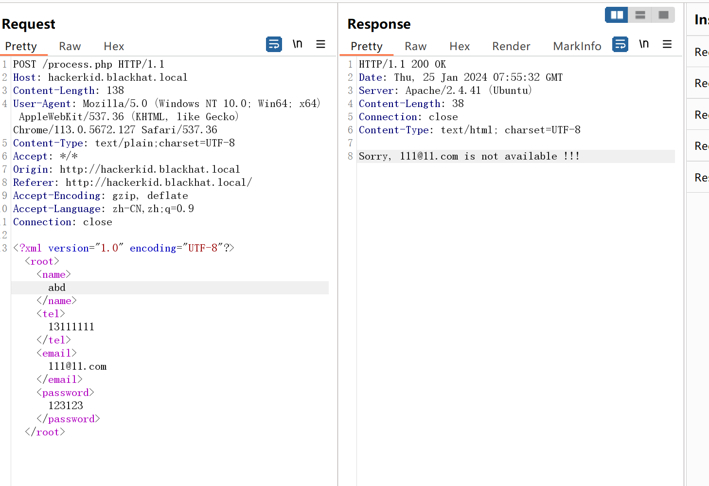 发现为xml格式,并且email字段会有回显,测试XXE漏洞