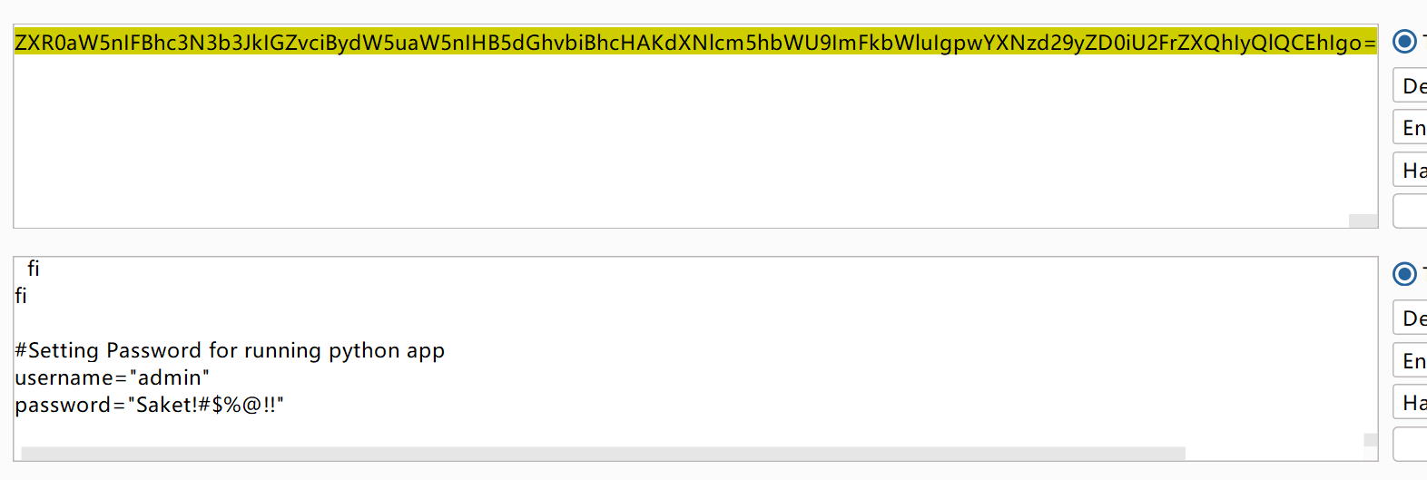 saket是可登录的用户,接下来探测/home/saket/.bashrc文件,直接探测没有返回结果,使用base64
