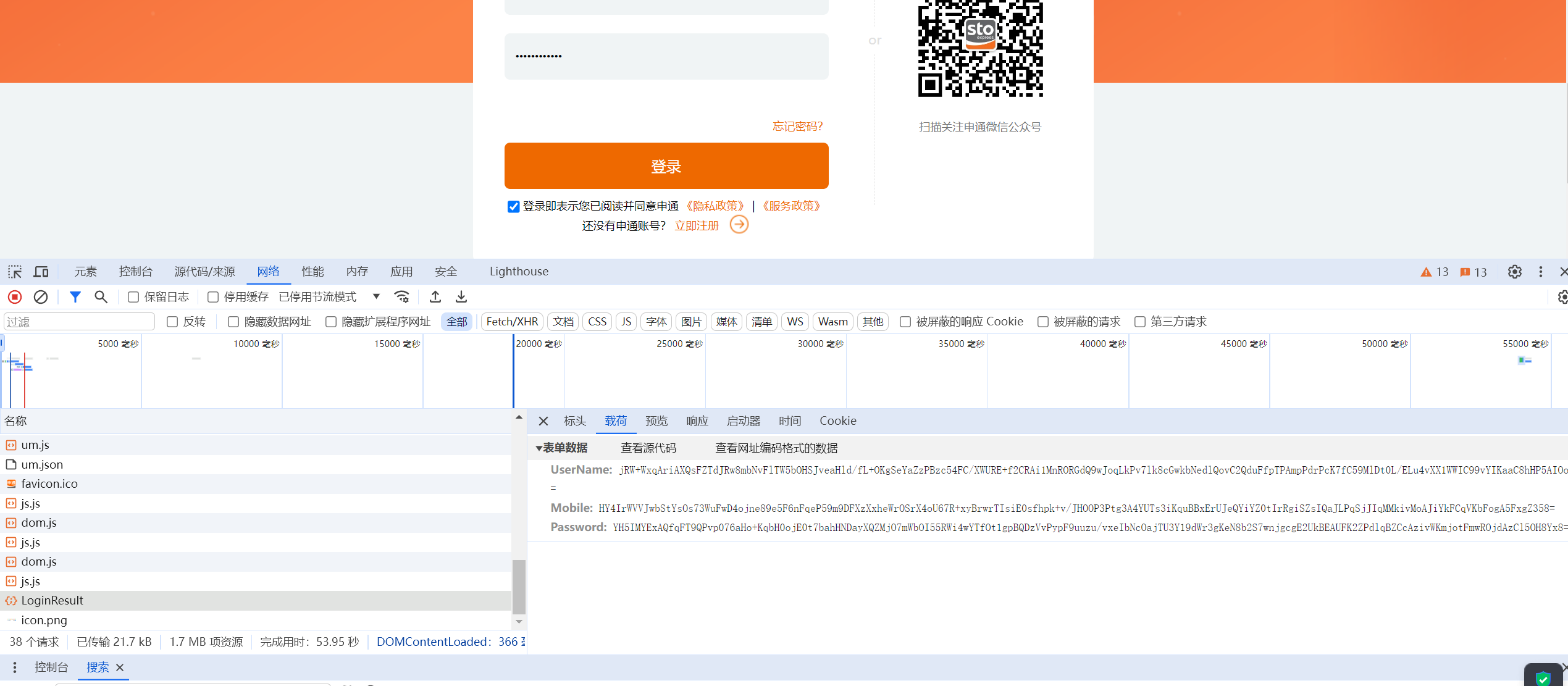 首先抓取登录数据包,可以看到载荷处存在加密数据
