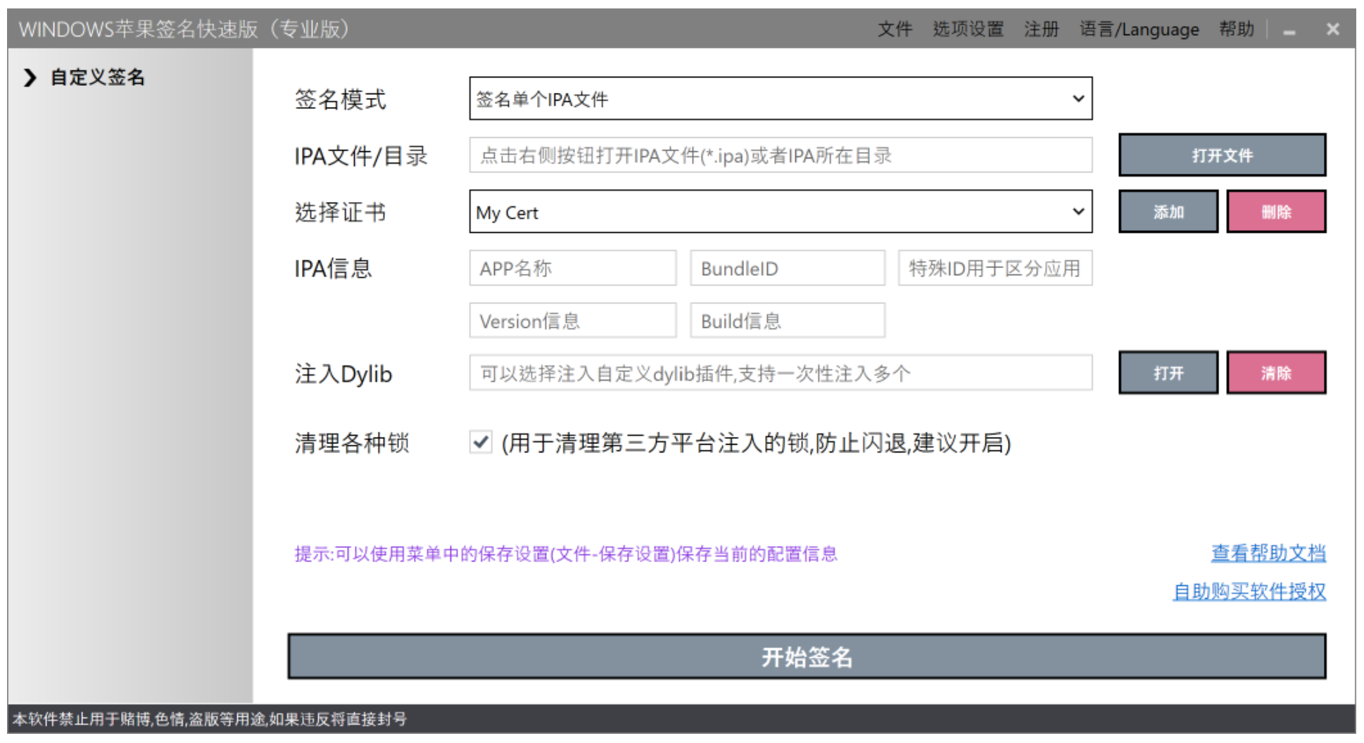 苹果应用IPA一键签名工具可以在Windows平台对苹果应用IPA文件重新签名,可以一键去除IPA内部的时间锁,无需MAC苹果电脑和配置XCODE开发环境,便可以直接对IPA文件进行签名,或者批量对苹果APP进行签名,同时支持修改BundleID,不受描述文件中的BundleID限制,使用简单方便。