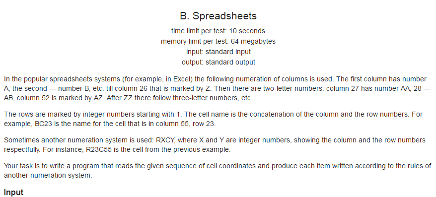 一,题目大意:一个坐标有两种表示方法,一种是RXCy,表示第几行,第几列。另一种是字母加数字,例如BC34(表示55列34行,A表第1列,Z表第26列,AA表第27列)