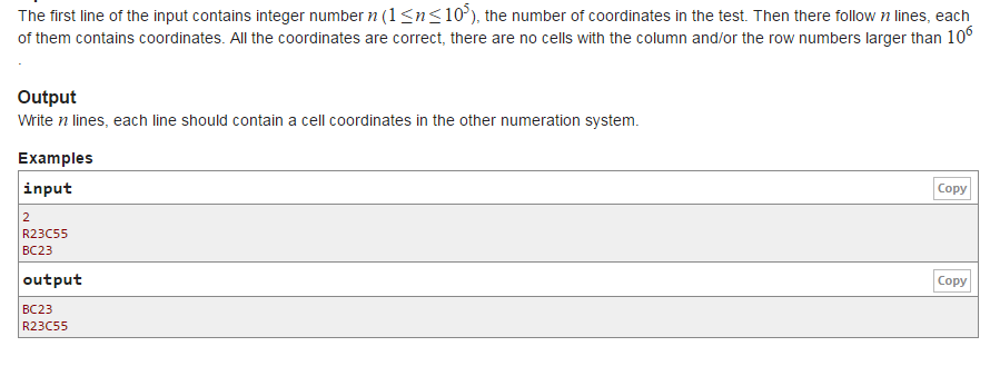 1 #include <stdio.h> 2 #include <string.h> 3 int col,row; 4 int sum[10]; 5 char str[15]; 6 int pd(int x) 7 { 8 int i=1; 9 while(x>sum[i])i++; 10 return i; 11 } 12 void calc() 13 { 14 int i=1; 15 col=row=0; 16 while(str[i]>='A'&&str[i]<='Z')col=(col<<4)+(col<<3)+(col<<1)+str[i++]-64; 17 while(str[i]>='0'&&str[i]<='9')row=(row<<3)+(row<<1)+str[i++]-'0'; 18 printf("R%dC%d\n",row,col); 19 } 20 int main() 21 { 22 int n,len,i,j,k; 23 sum[1]=26; 24 for(i=2;i<=5;i++)sum[i]=(sum[i-1]+1)*26; 25 char pstr[15]; 26 scanf("%d\n",&n); 27 while(n--) 28 { 29 memset(str,0,sizeof(str)); 30 memset(pstr,0,sizeof(pstr)); 31 scanf("%s",str+1); 32 if(str[1]=='R') 33 { 34 j=2;row=0; 35 while(str[j]>='0'&&str[j]<='9') 36 { 37 row=(row<<1)+(row<<3)+str[j]-'0'; 38 j++; 39 } 40 if(str[j]=='C'&&(j++)>2) 41 { 42 col=0; 43 while(str[j]>='0'&&str[j]<='9')col=(col<<1)+(col<<3)+str[j++]-'0'; 44 len=pd(col); 45 while(len) 46 { 47 k=col%26; 48 col/=26; 49 if(k==0)col-=1,k+=26; 50 pstr[len--]=k+64; 51 } 52 printf("%s%d\n",pstr+1,row); 53 } 54 else calc(); 55 } 56 else calc(); 57 } 58 return 0; 59 }
