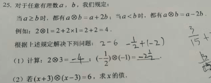 1、第27题题意理解上的问题,可能是受了第25题那种题型的干扰,我们定义一种新的运算表达式,其实质的含义是一种记法,表达一种展开关系,比如 a ☆ b = a + 2b,其中的等号表达的是把 a + 2b 记作 a ☆ b,或者说 a ☆ b 可以展开为 a + 2b 这个常规的表达式,这个表达式实际就是初一数学教材里定义的多项式。而第27题里的 ax = b,其中的等号表达的是等号两端的两个表达式的值满足相等关系。概言之,前者是用一个表达式定义一种运算;后者是关于两个表达式的等式。孩子还没有清晰认识到这一点。