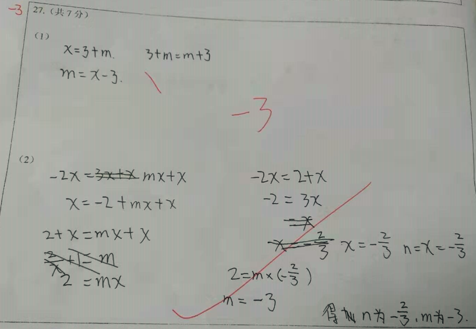 2、第27题的第二小问是求 m 和 n 两个未知数的值,其实质是二元方程组求解,应用代入法是常规做法之一,但是从实际解题过程看,孩子对 x = n的代入应用是反常规的,虽然也能正确求解,但难免给人一种误打误撞的感觉。