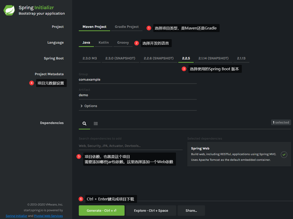登录https://start.spring.io/平台,见到如下的界面。进行项目的基本信息设置,以及相关的依赖描述。