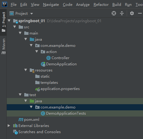 上图就是一个Spring Boot的简单项目可以看到是一个maven的项目,包含了启动类、测试类、配置文件等。