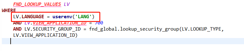 oracle数据库视图中存在数据,但是jdbc查询视图查询不出来,后发现视图中有根据默认语言的过滤,如下图: