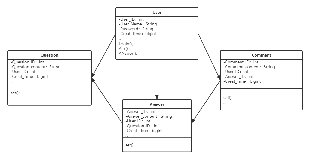 回答类包括:回答ID,回答内容,回答者ID,所属问题ID,回答创建时间。