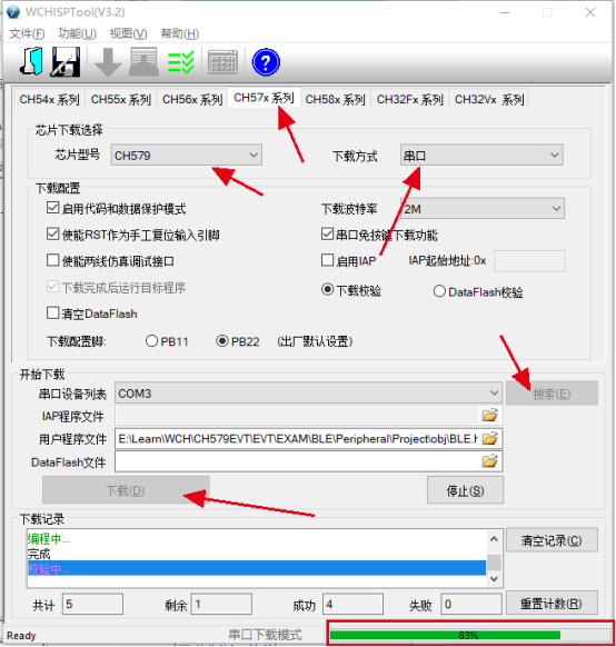驱动安装完成后,打开下载软件,依次选择芯片系列(CH57X)→芯片型号(CH579)→下载方式(串口)→选择烧录文件,此时接入USB到UART位置,点击下载软件的“搜索”,选择新增的串口号,并点击“下载”按钮,使软件进入下载状态。