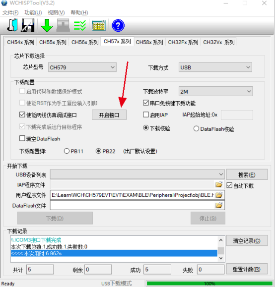 CH579M支持三种下载方式,分别是:USB下载、串口下载、SWD下载。