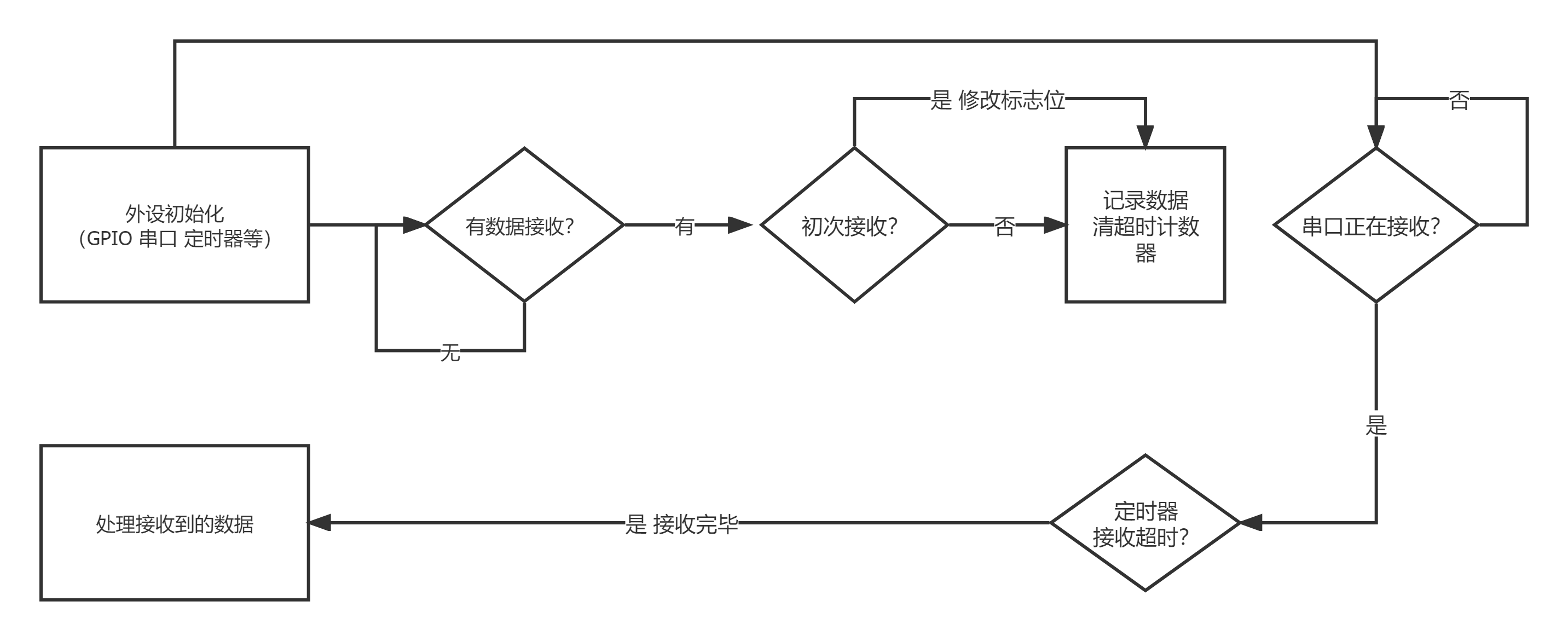 - 外设初始化,包括GPIO、串口、定时器等外设,此后程序将进入串口接收待机状态。