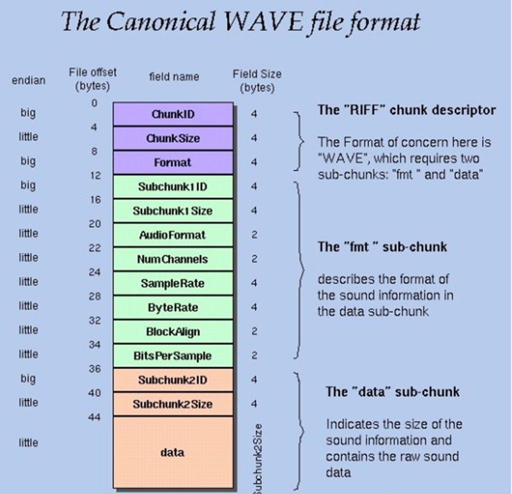 | 音频数据区 | 可变 | 二进制流 | PCM编码下为线性整数/浮点数:16位位深对应int16_t,8位对应uint8_t,32位浮点对应float |