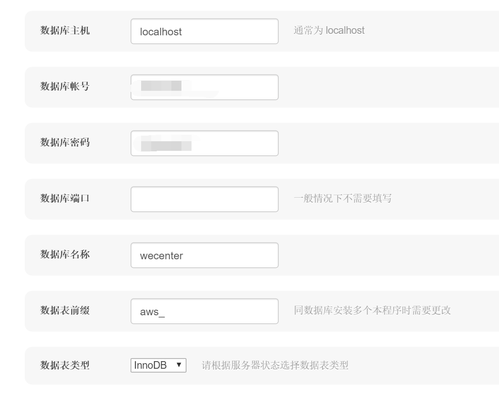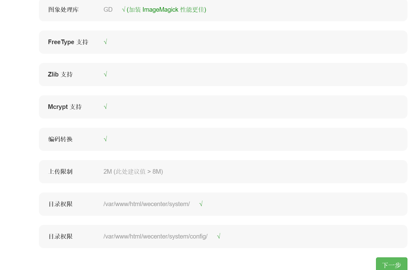 • 欢迎使用 欢迎使用 WeCenter 安装程序, WeCenter 是中国首个基于 PHP + MYSQL 开发的开源化社交问答社区 • 服务器环境检查 为了确保程序安装顺利, 您的服务器需要满足以下系统需求的运行环境 PHP 版本5.4.16√ 数据库模块PDO_MYSQL√ Session 支持√ Cookie 支持√ CType 支持√ CURL 支持√ 图象处理库GD√ (加装 ImageMagick 性能更佳) FreeType 支持√ Zlib 支持√ Mcrypt 支持√ 编码转换√ 上传限制2M (此处建议值 > 8M) 目录权限/var/www/html/wecenter/system/√ 目录权限/var/www/html/wecenter/system/config/√