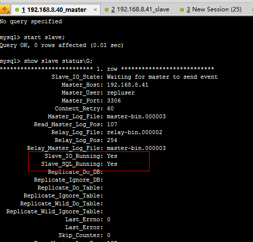 mysql> CHANGE MASTER TO MASTER_HOST='192.168.8.41',MASTER_USER='repluser',MASTER_PASSWORD='replpass2014',MASTER_LOG_FILE='master-bin.000003',MASTER_LOG_POS=107;