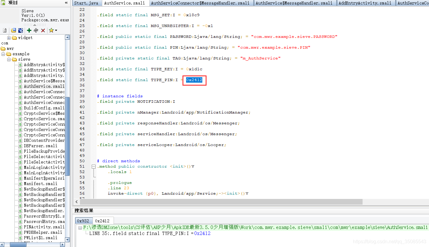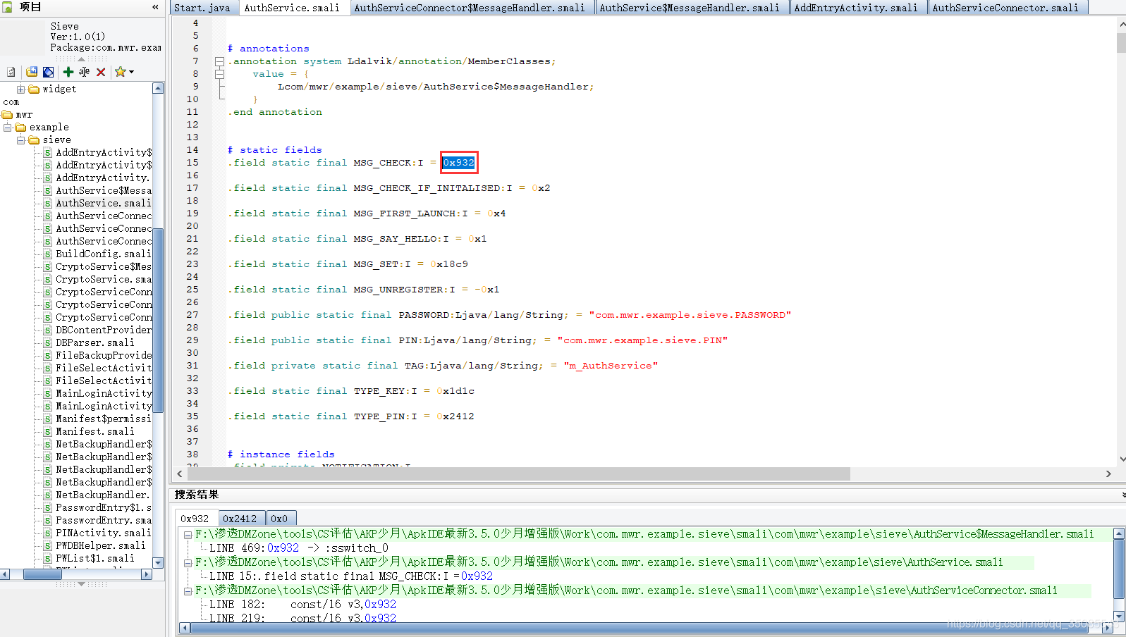 对APK进行反编译,然后查看AuthService.smali中的handlemessage()方法:
