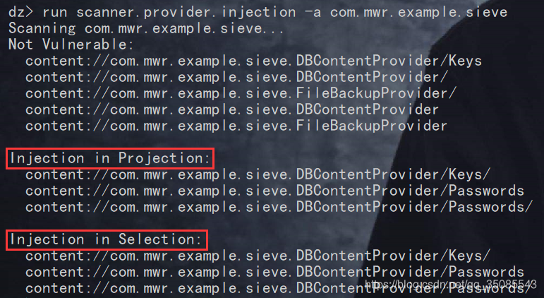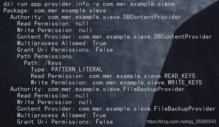 a)run app.provider.query content://com.mwr.example.sieve.DBContentProvider/Keys/