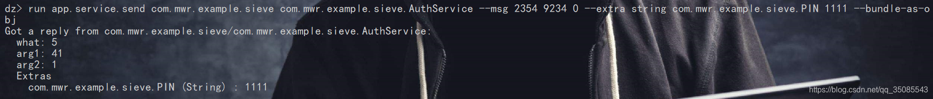 run app.service.send com.mwr.example.sieve com.mwr.example.sieve.AuthService --msg 2354 9234 0 --extra string com.mwr.example.sieve.PIN 1111 --bundle-as-obj