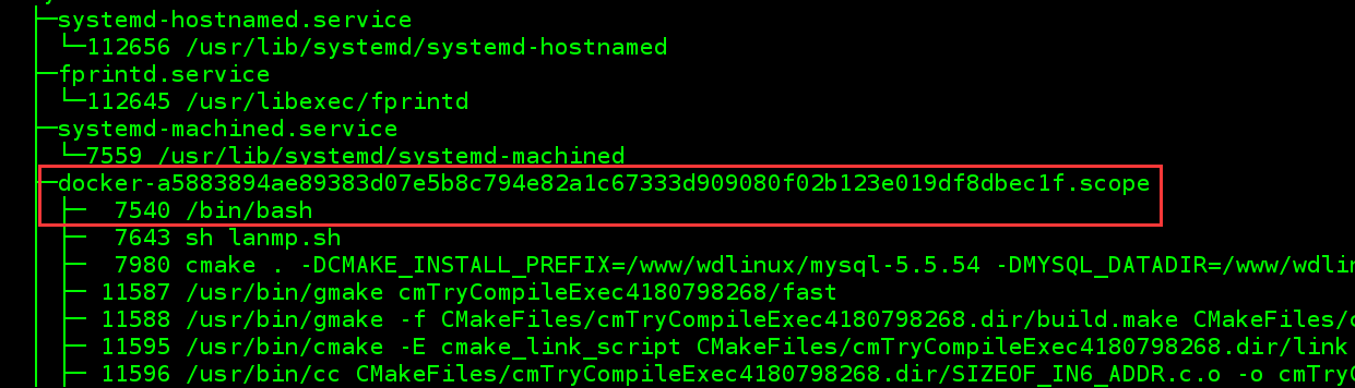 红色处7540为当前运行的docker中容器ID为a5883894ae89的容器的PID。