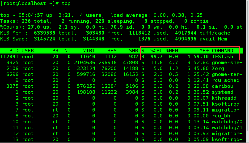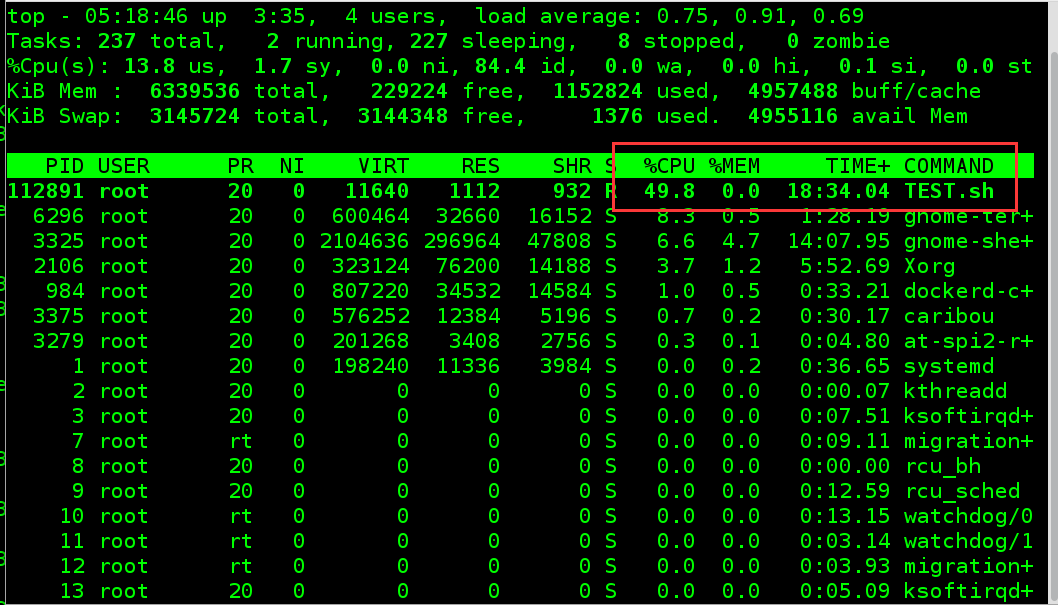 3.再打开一个终端,执行top,查看实时资源使用率: