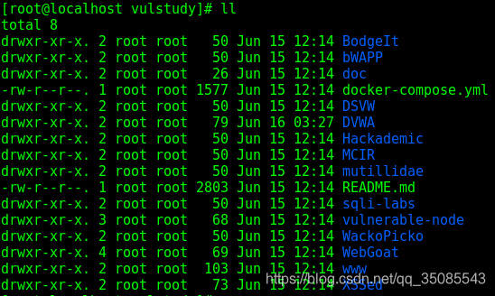 1.下图是vulstudy目录中的文件,可以看到有一个docker-compose.yml文件,在这里我们只需要运行docker-compose up -d 即可同时创建所有目录中存在的靶机环境,当然,这个过程会有点慢,因为每个靶机环境中并不包含相应镜像文件,下载这些文件的操作被写到了每个环境对应的Dockerfile(用来描述如何创建镜像的过程的文件)中。会先去执行这些Dockerfile创建镜像,然后才运行它们。