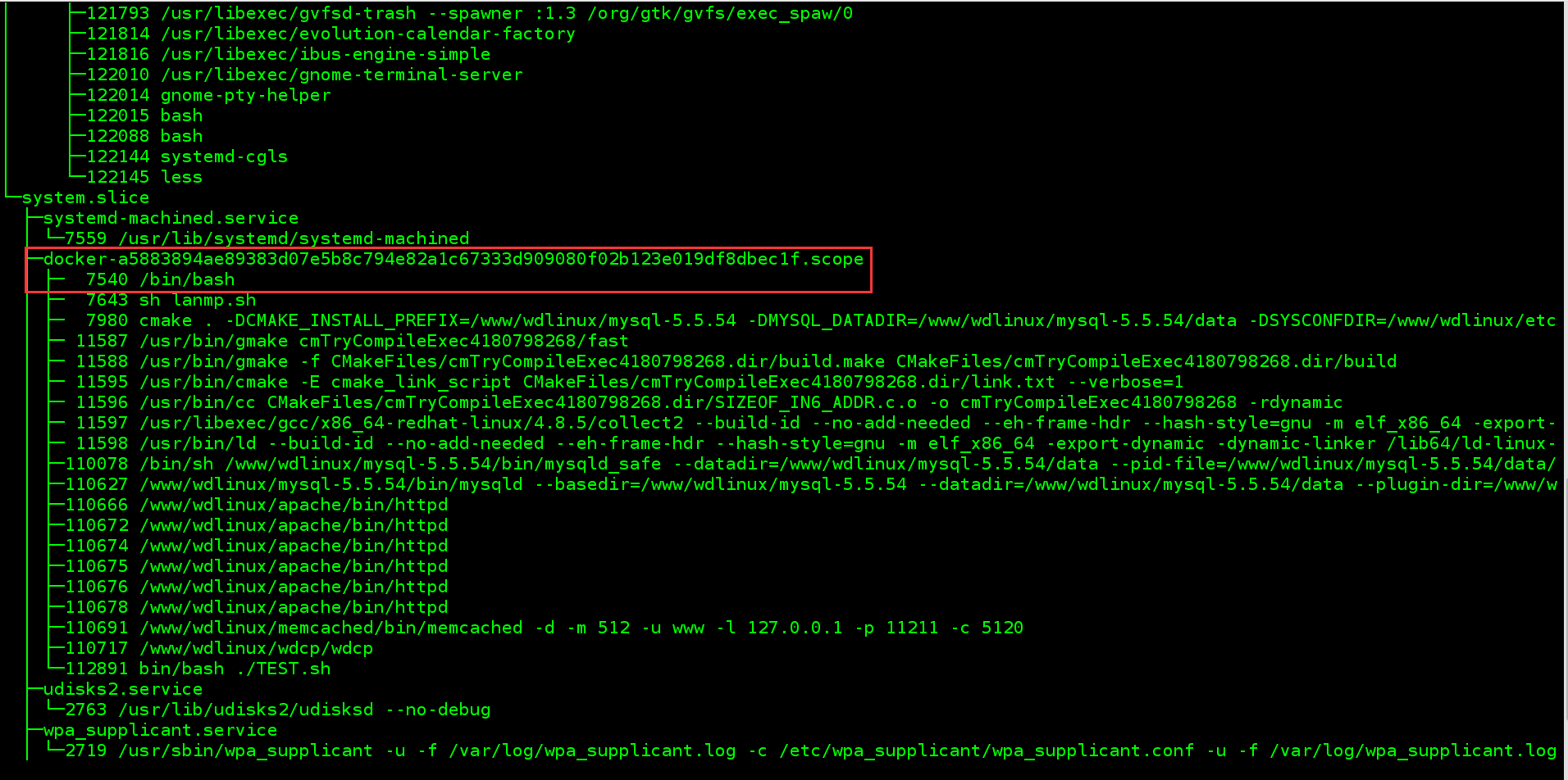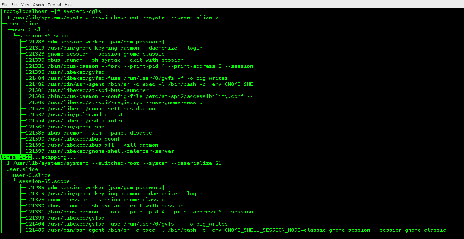 执行命令:systemd-cgls 查看cgroups tree: