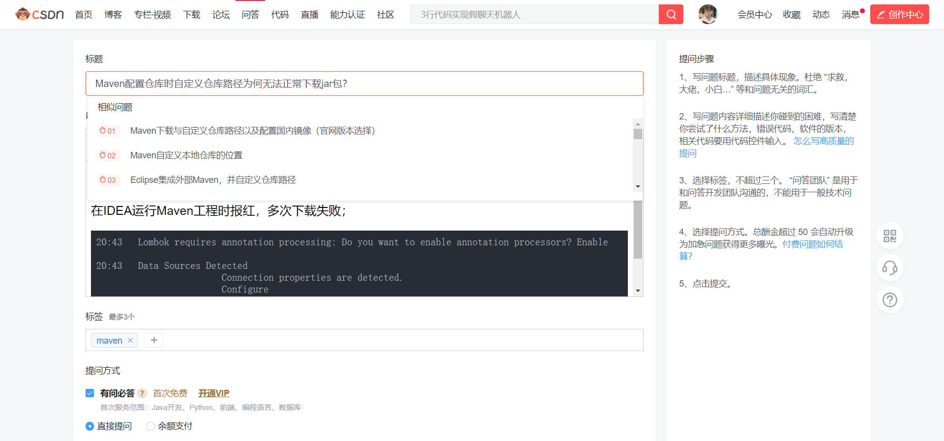可以看到右端可选择问题类型的提问模板,并提供markdown语法,推荐。