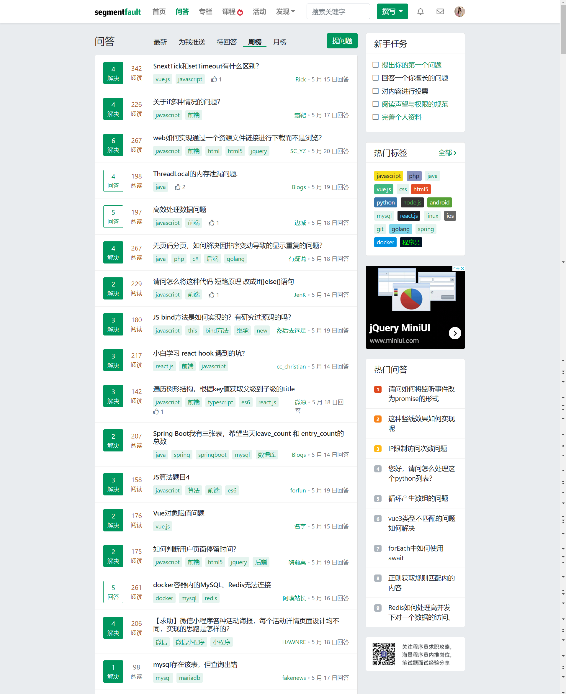 SegmentFault问答区由主体有最新/推送/待回答/周榜/月榜基类供筛选,右侧侧边栏也极为舒适,由新手任务和热门标签、热门问答构成。