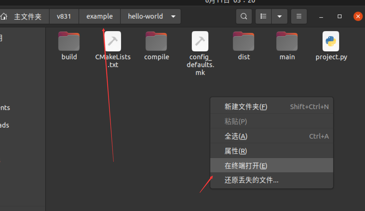 如果想使用vscode开发也可以下载一个vscode配置环境,本次使用终端来编译,打开例程后使用终端打开: