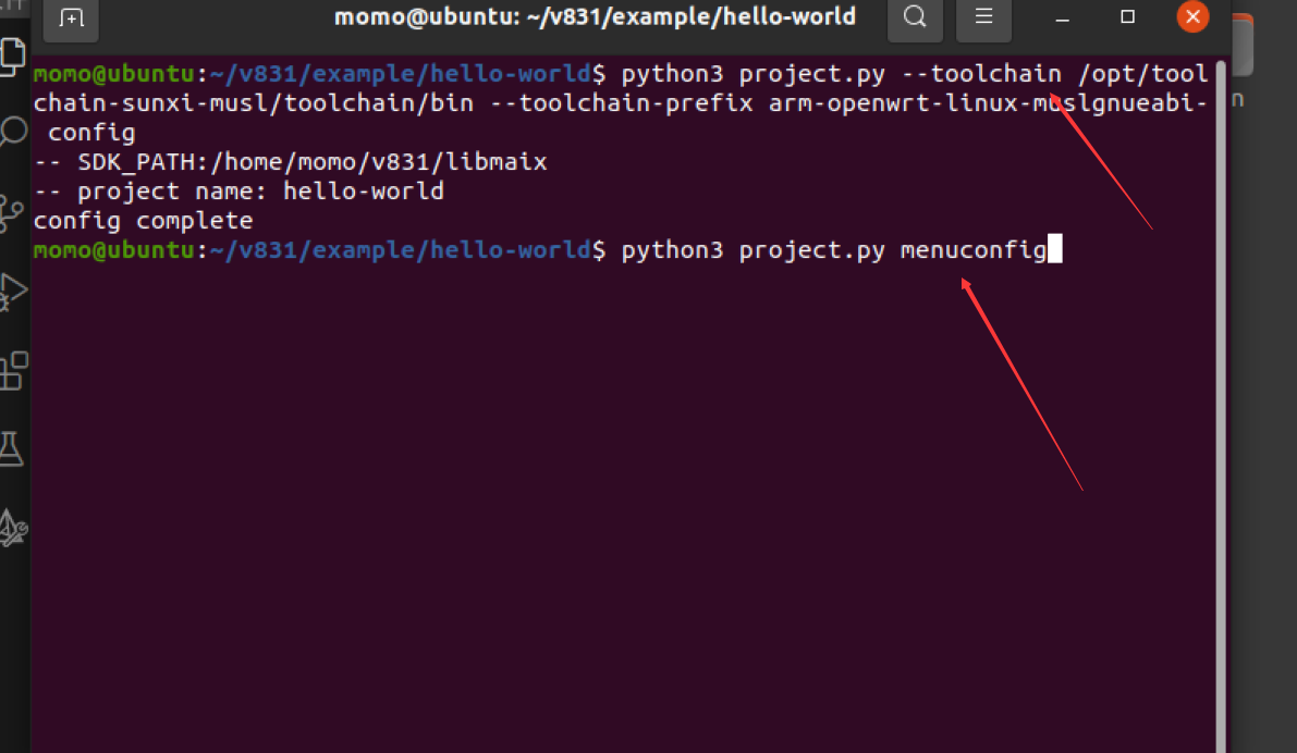 输入python3 project.py --toolchain /opt/toolchain-sunxi-musl/toolchain/bin --toolchain-prefix arm-openwrt-linux-muslgnueabi- config,输入一次即可,后续不需要(可能一开始也不需要)。
