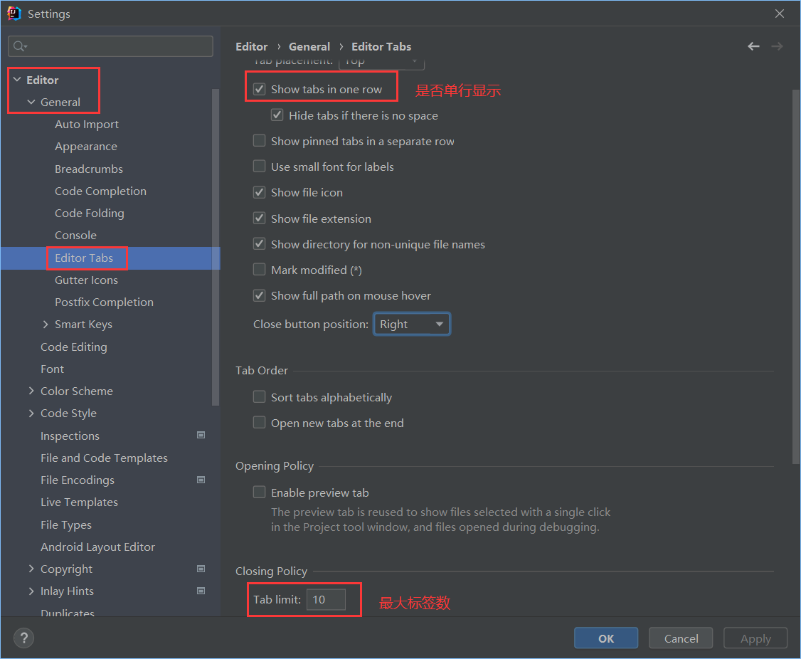 说明:默认状态下是单行显示的,最大是十个,超过会关闭最早的页面,可以根据图片来修改