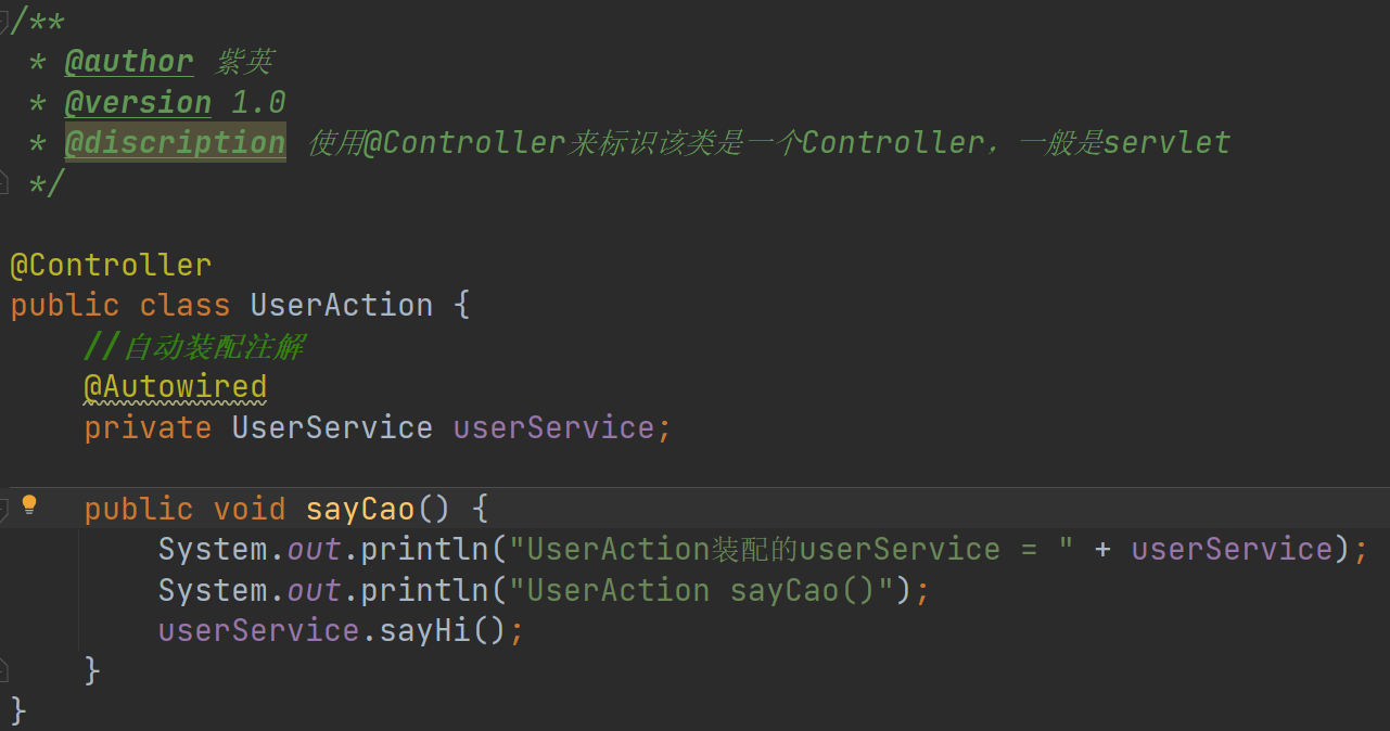 @Test //通过自动装配获取bean public void setBeanByAutoWire() { //创建一个容器,并和配置文件关联(一个容器关联一个配置文件) ApplicationContext ioc = new ClassPathXmlApplicationContext("beans.xml"); OrderAction orderAction = ioc.getBean("orderAction", OrderAction.class); System.out.println(orderAction.getOrderService()); System.out.println(orderAction.getOrderService().getOrderDao()); }