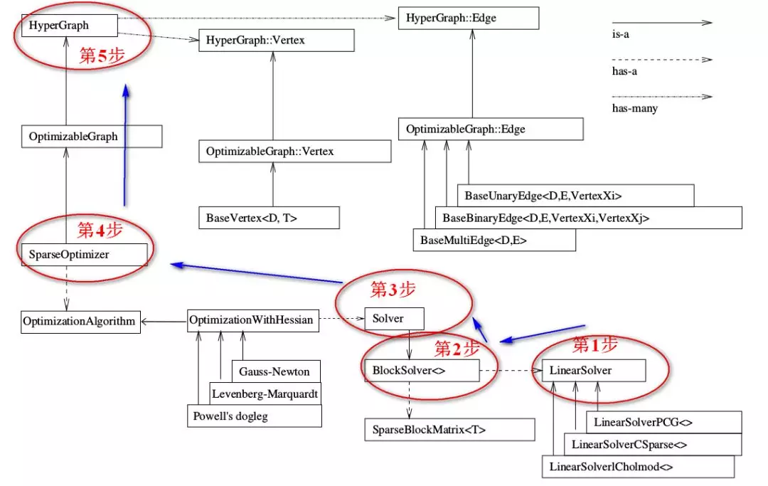 一个 SparseOptimizer 拥有一个 Optimization Algorithm,继承自Gauss-Newton, Levernberg-Marquardt, Powell's dogleg 三者之一。