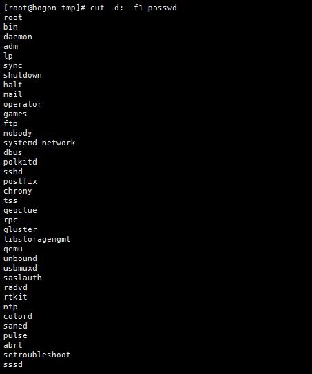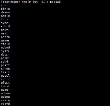 #截取以冒号为分隔符的第一列 [root@bogon tmp]# cut -d: -f1 passwd