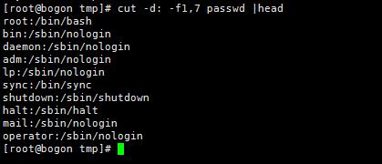 #截取前十行首列及第七列 [root@bogon tmp]# cut -d: -f1,7 passwd |head