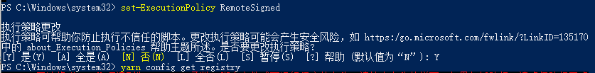 过程中提示询问是否要更改执行策略?,选择 A 或 Y 。如下图: