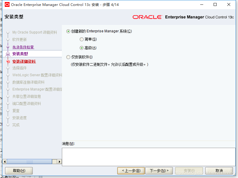 ①选简单、高级、仅安装软件都行(仅安装软件,可以在安装完成后到oms home目录下进行手动配置,如 /u01/app/oracle/Middleware/oms/sysman/install/ConfigureGC.sh)