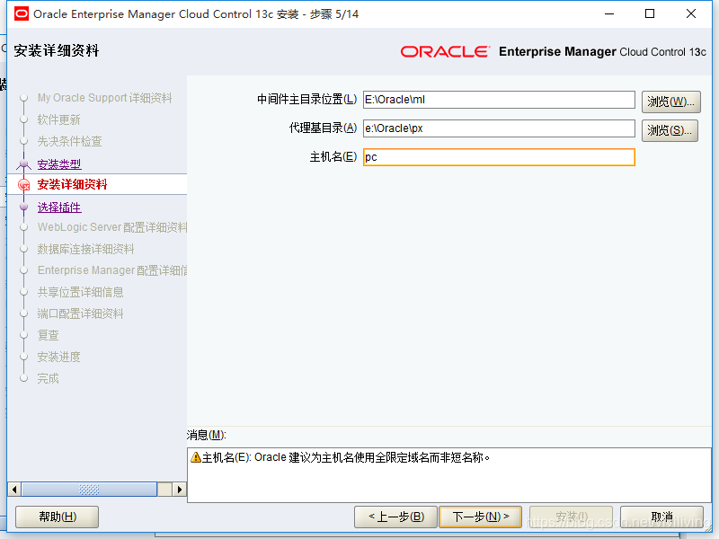 ②选择oracle enterprise manager的middleware及agent目录(注意要为空目录),以及主机名