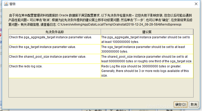 ⑥选择完数据库连接详细信息后,安装软件会自动check相应的配置,给出warnings或者errors,根据warnings或errors给出的recommendation进行相应的调整
