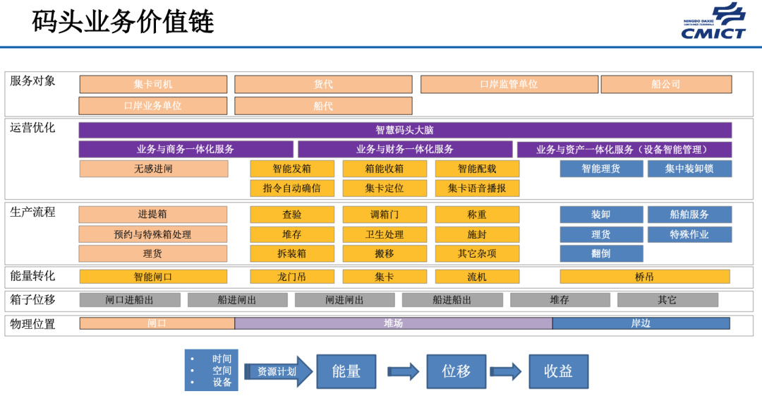是如何在最佳的时间利用最佳的空间和设备将作业对象(集装箱)移动到目标位置,满足客户目标,从而带来收益。是通过最优空间(场地)利用和作业设备设备利用,将设备的能量转化为箱子的位移。所以集装箱码头终极要解决的问题是怎么找到最佳的时间、空间和让最佳的设备来作业。所以,传统码头的自动化不是无限贴近全自动化码头的方案,他们两的交集不是在方案上,而是在物流企业的第一性原理上,即资源计划的最优化。