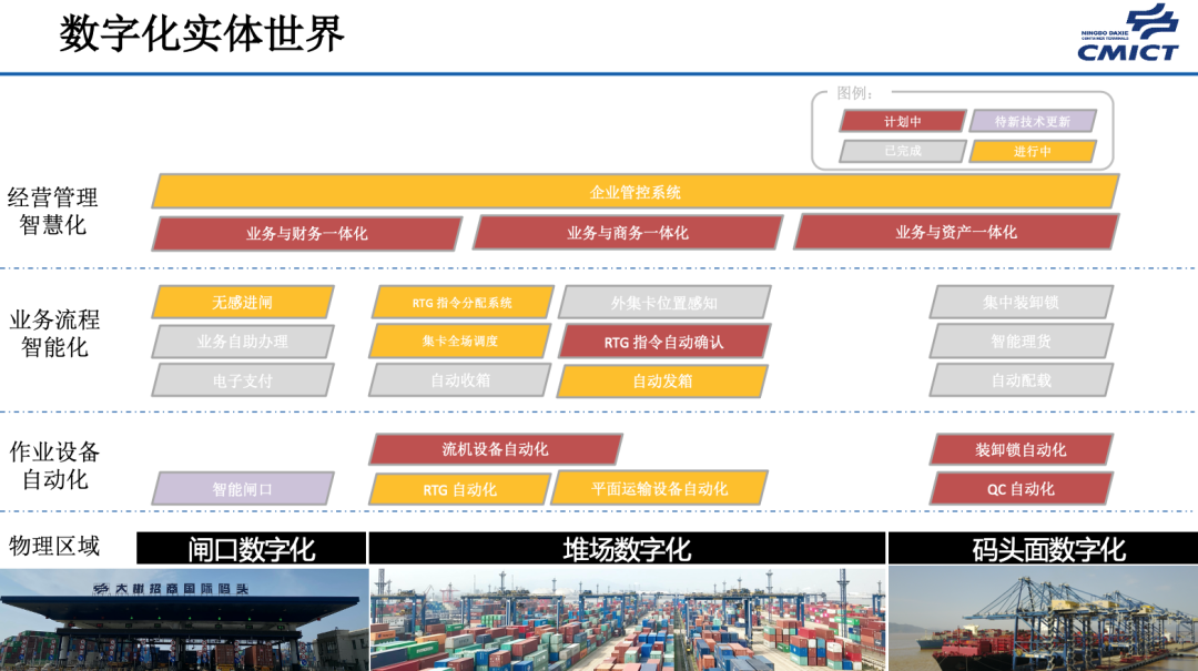 图片来源《CMICT 智慧化规划框架》——自主设备来借用一下高德纳(乍一看这个中文名字以为它爸爸是高德导航)的名词,他们把带智能的、智慧化设备叫做自主物件,作为智慧码头的组成部分,我觉得这个名词很好,我把码头内的自动化设备称为自主设备。现阶段,传统码头的改造主要就是集中在以下两个方面:01