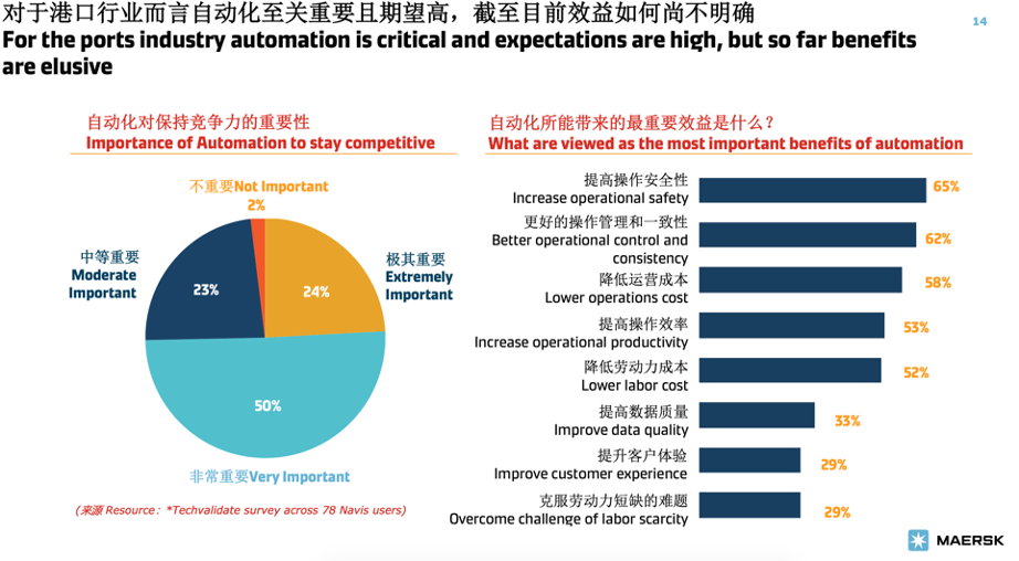 可以看到一半的港口管理者认为自动化非常重要,但是对于自动化带来的最重要的效益,一半以上的认为是操作安全性,这个确实是当下自动化要解决的首要问题,除了这个好处,也有差不多数量的管理者已经感知到自动化带来的“更好的操作管理和一致性”以及“降低运营成本”。我认为,这两项效益是否明显完全取决 于自动化改造项目的出发点和初衷,如果把自动化改造,看做是作业设备和业务流程数字化的一种方式,当作传统企业数字化转型的一道工序,那么上述两效的效益会更好,而且会越来越容易显现。