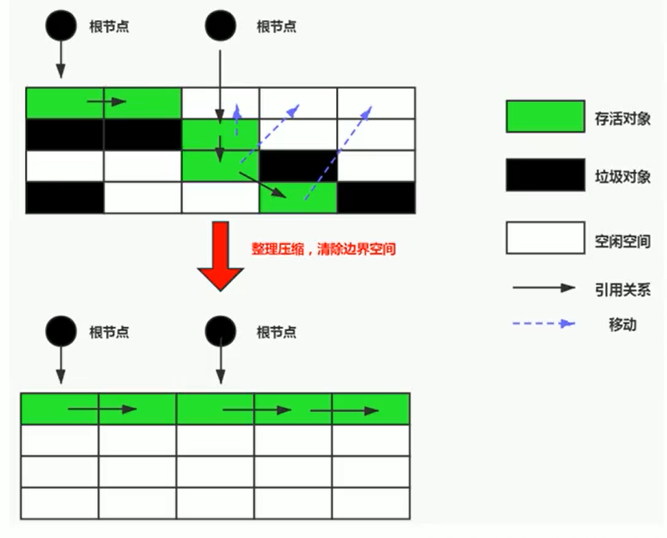 第二阶段将所有存活对象压缩到内存的一端,按序排放,最后清除边界所有的空间。