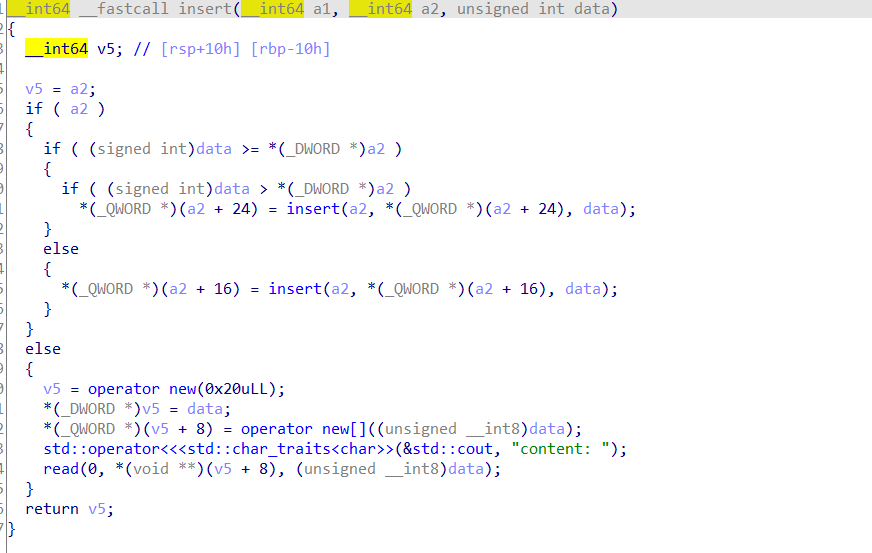 __int64 __fastcall show(__int64 a1, __int64 a2, int a3) { __int64 result; // rax __int64 v4; // rax __int64 v5; // rax __int64 v6; // [rsp+28h] [rbp-8h] result = a2; v6 = a2; if ( a2 ) { while ( v6 ) { if ( a3 == *(_DWORD *)v6 ) { std::operator<<<std::char_traits<char>>(&std::cout, "content: "); v5 = std::operator<<<std::char_traits<char>>(&std::cout, *(_QWORD *)(v6 + 8)); return std::ostream::operator<<(v5, &std::endl<char,std::char_traits<char>>); } if ( a3 <= *(_DWORD *)v6 ) result = *(_QWORD *)(v6 + 16); else result = *(_QWORD *)(v6 + 24); v6 = result; } } else { v4 = std::operator<<<std::char_traits<char>>(&std::cout, "Not Find"); result = std::ostream::operator<<(v4, &std::endl<char,std::char_traits<char>>); } return result;