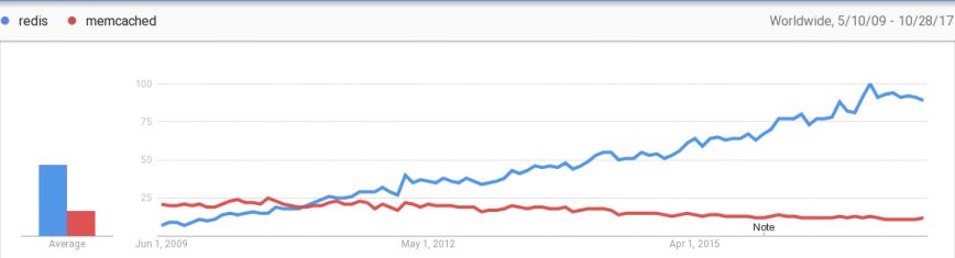这里只找到一张截止到17年时的使用率对比分析,不难看出Redis使用率一直呈现上升趋势,到目前更是远远的甩下了memcahce。